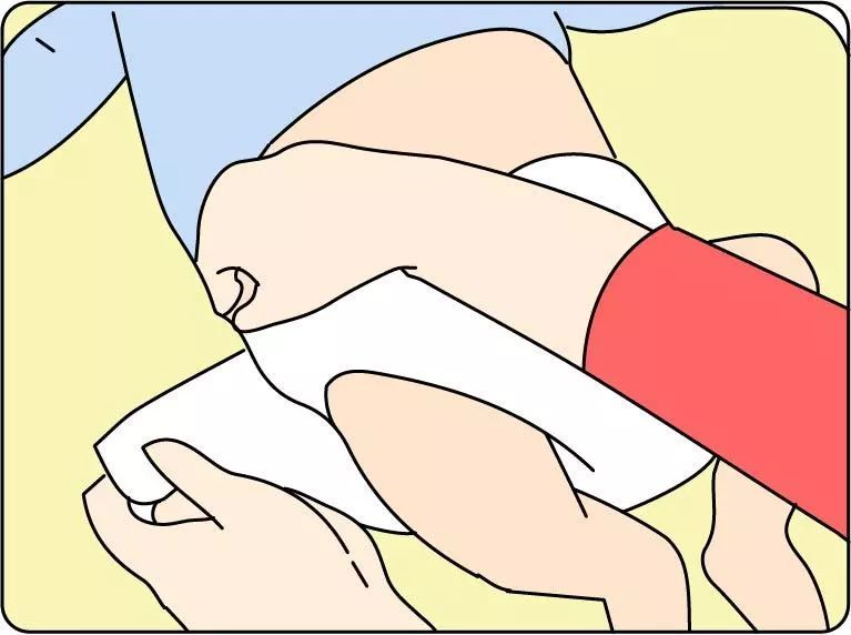 1)把在温水中浸湿的毛巾拧干,轻轻擦拭被纸尿裤覆盖的股沟、大腿里、夹缝处、私处;